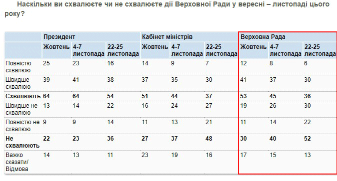 Из отчета КМИС: "На 9% стало меньше тех, кто одобряет работу (45% и 36%) и на 12% больше тех, кто не одобряет работу Рады (40% и 52%).