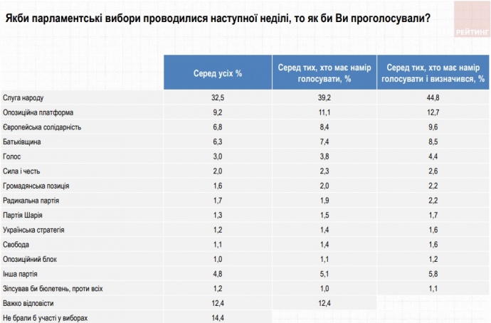 12,7% поддерживают партию "Оппозиционная платформа - За жизнь", 9,6% – партию "Европейская Солидарность", 8,5% – "Батькивщину", 4,4% – "Голос".