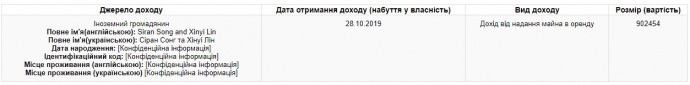 Детали: На сайте НАПК указаны данные, согласно которым 28 октября Зеленский получил 902454 грн дохода от сдачи имущества в аренду иностранным гражданам Сирано Сонгу и Хинуи Лину.