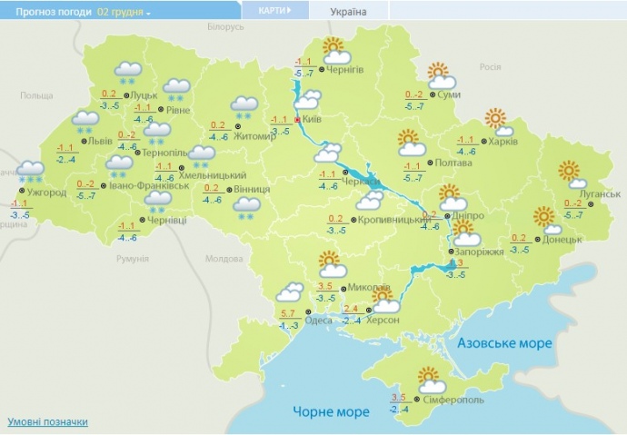 Дословно: "По данным Укргидрометцентра, днем 2 декабря в западных, Винницкой, Житомирской областях, в течение суток 3 декабря в Украине, кроме южных областей, снег и мокрый снег, образование снежного покрова высотой 3-8 см.