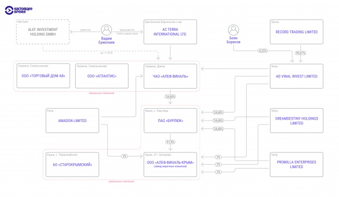 Как выяснили журналисты, после аннексии Крыма в марте 2014 года "Алеф-Виналь" юридически разделил свой бизнес – на украинскую и российскую части. ООО "Алеф-Виналь- Крым" зарегистрировалось в российском реестре в ноябре 2014 года.
