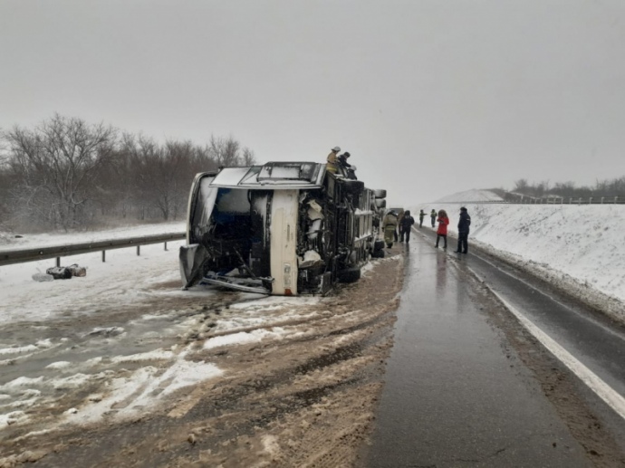 Дословно в сообщении МВД: "Сегодня в 12.30 часов на 763 км автодороги М4-"Дон" в Богучарском районе 59-летний водитель междугороднего автобуса "Ман", двигаясь в сторону юга, не справился с управлением своего транспортного средства и допустил его опрокидывание".
