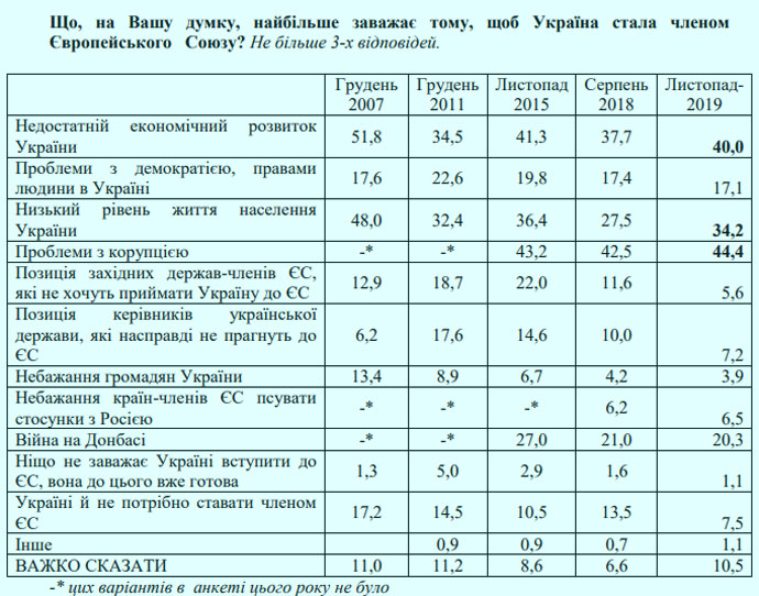 По мнению украинцев, больше всего мешают Украине стать членом ЕС проблемы с коррупцией (44%), недостаточный экономическое развитие Украины (40%) и низкий уровень жизни населения (34%). Войну на Донбассе в этом контексте указали 20% опрошенных.