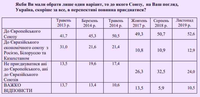 53% граждан уверены, что Украина должна в перспективе присоединиться к Европейскому Союзу, Евразийский экономический союз с Россией, Беларусью и Казахстаном выбирают 13%.