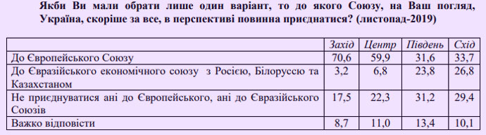 Дословно: "Внешнеполитическая ориентация на Россию существенно упала после аннексии Крыма, а особенно – после военной агрессии России на Донбассе. Правда, большинство из тех, кто возлагал надежды на присоединение к союзу с Россией, перешли в ряды тех, кто считает, что Украине не нужно присоединяться ни к Европейскому, ни к Евразийскому союзу".