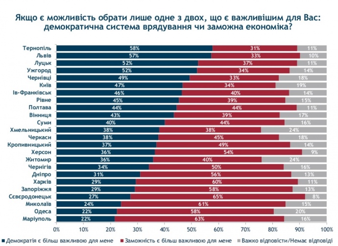 В то же время, прослеживается тенденция: в западных городах люди чаще выбирали демократию, в восточных – обеспеченность. Так, больше всего опрошенных (58%) выбрали демократию в Тернополе, а больше всего выбрали состоятельность в Мариуполе (63%).