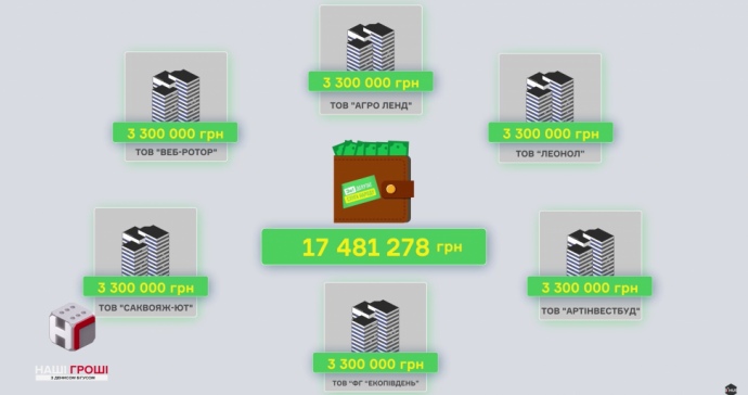 Дословно: "Почти 20 миллионов гривен политсиле досталось от шести компаний – ООО "Агро Ленд", ООО "Веб-Ротор", ООО "Леонол", ООО "Саквояж-ЮТ", ООО "Артинвестбуд" и ООО "ФГ "Екопивдень".