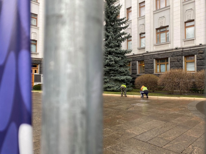 Во дворе перед входом в Офис президента Украины монтируют новогодний каток.