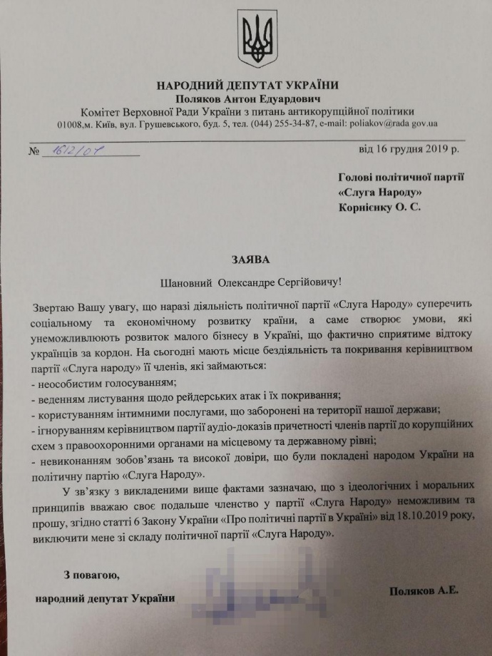 Депутат "Слуги народа" написал заявление о выходе из партии