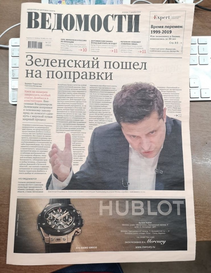 Российская газета "Ведомости" 17 декабря вышла из фото президента Украины Владимира Зеленского и рекламой часов Hublot на первой полосе.