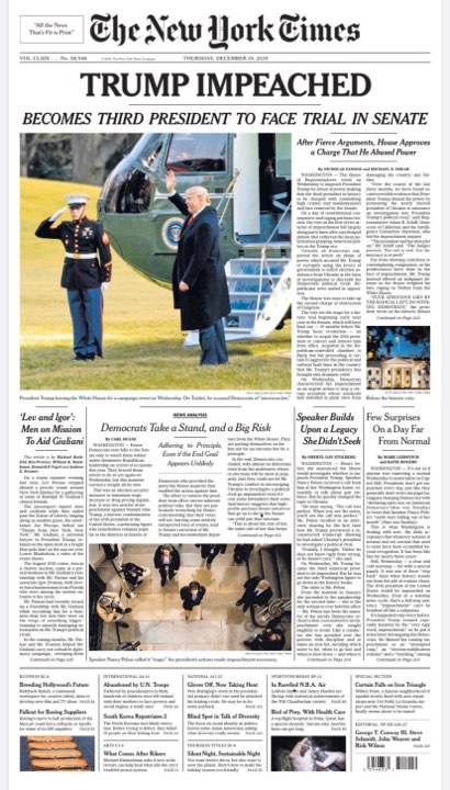 - Комитет по разведке Палаты представителей Конгресса США обнародовал отчет об импичменте по обвинению президента Дональда Трампа в злоупотреблении властью и препятствовании Конгресса.