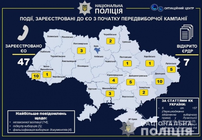 Заместитель председателя Нацполиции сообщил, что с начала предвыборной кампании полиция зарегистрировала 47 нарушений, связанных с избирательным процессом. В основном указанные факты связаны с незаконной агитацией - 14 фактов, подкупом избирателей - 5 и фальсификация избирательных документов - 4 факта.