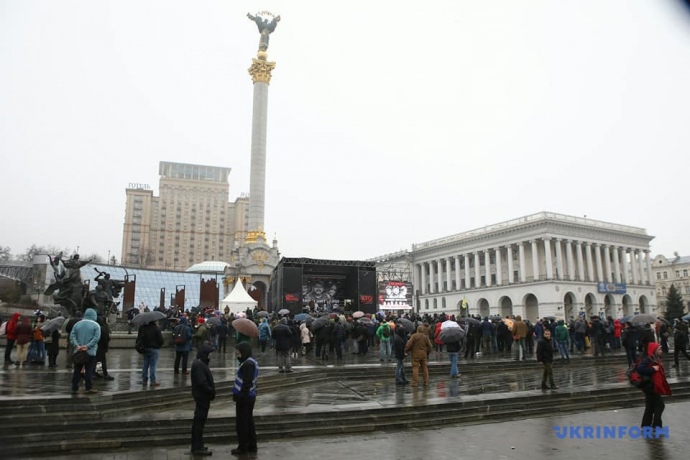 Детали: У Монумента Независимости построена сцена, на которой размещены плакаты "#яневірю: білими нитками" та "Хто наступний?".
