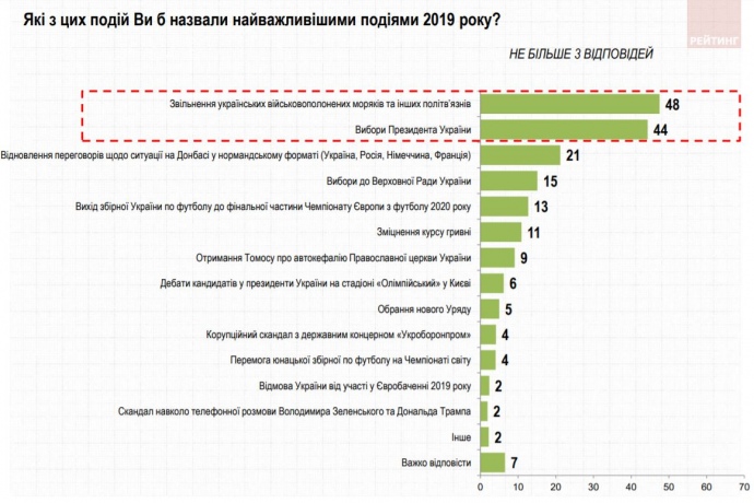 Детали: Событиями года украинцы считают освобождение украинских военнопленных моряков и других политических заключенных (48%), а также выборы президента Украины (44%).