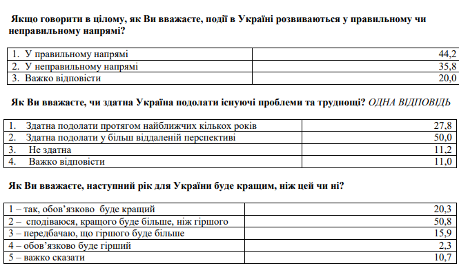 А наиболее вероятно, что НЕ произойдет, по мнению украинцев: уменьшение коррупции (считают это вероятным 30%, нет – 59%), наказание коррупционеров (предположительно – 31%, нет – 58%), установление справедливого правосудия (вероятно – 30%, нет – 56%), снижение уровня преступности (предположительно – 32%, нет – 53%), снижение тарифов (предположительно – 31%, нет – 58%).