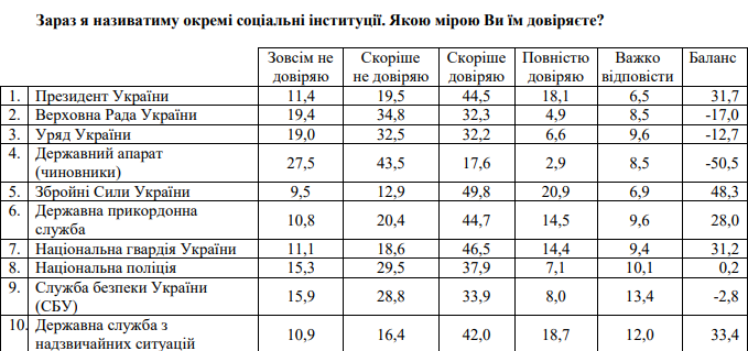 Дословно: "Среди социальных институтов наибольшим доверием граждан пользуются Вооруженные силы Украины (71% доверия, 22% недоверия, баланс доверия-недоверия составляет +48%), церковь (доверяют 65%, не доверяют 25%, баланс доверия +40%), волонтерские организации (доверяют 64%, не доверяют 26%, баланс доверия +39%).