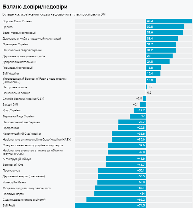 Наиболее негативно украинцы относятся к СМИ России (доверяют 7%, не доверяют 82%, баланс доверия-недоверия составляет -75%). Среди украинских институтов граждане больше всего не доверяют судебной системе (баланс доверия-недоверия -62%), политическим партиям (-54%), местным судам (-53%), коммерческим банкам (-51%), прокуратуре (-50%), государственному аппарату, чиновникам (-51%), Верховному суду (-42%), антикоррупционному суду (-42%), Национальном агентству по предотвращению коррупции (-40%), Специализированной антикоррупционной прокуратуре (-40%), Национальному антикоррупционному бюро Украины (-36%), Конституционному суду Украины (-36%).