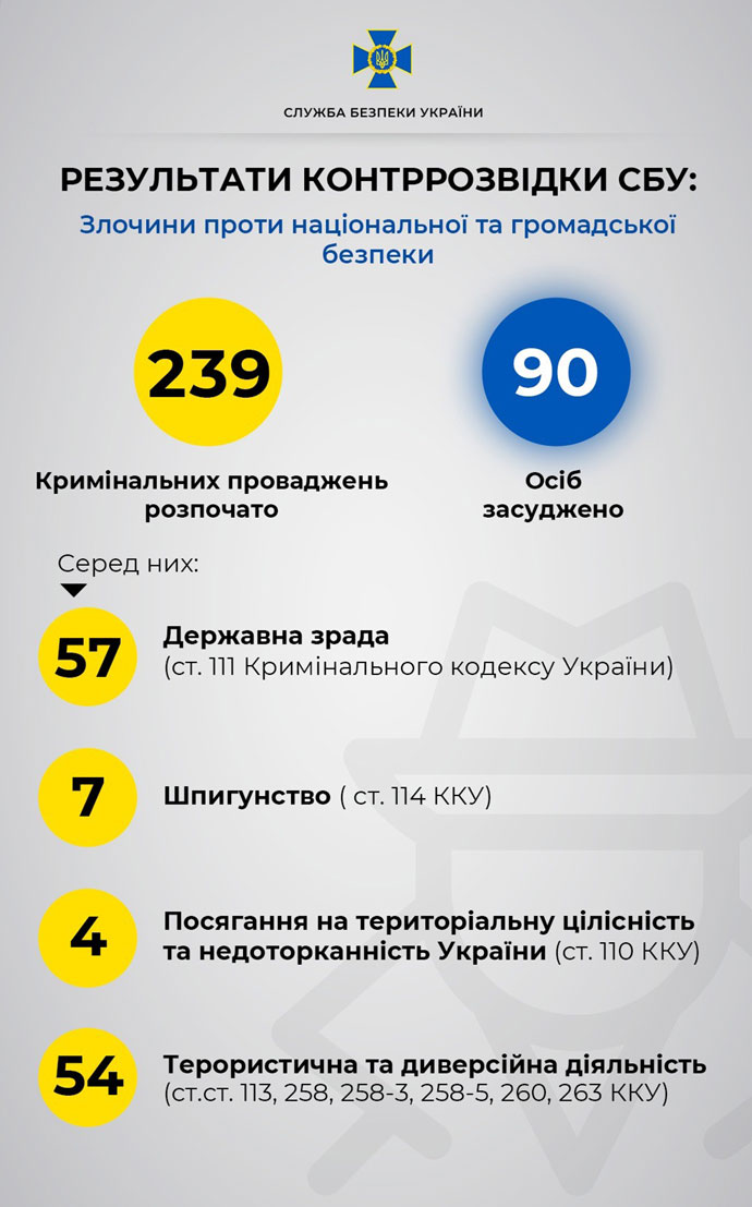 Контрразведка Службы безопасности Украины отчитывается, что за год за преступления против основ национальной и общественной безопасности к различным срокам и видам наказания были осуждены 90 человек.