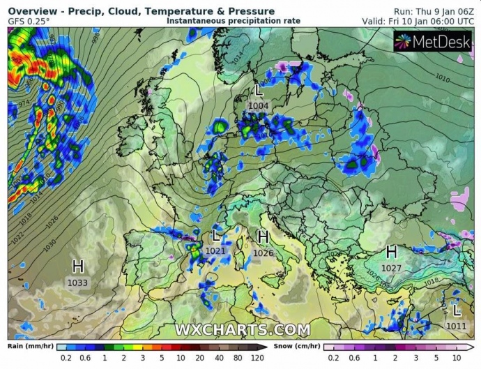 Синоптик Диденко: "Циклон с центром недалеко от Дании зашлет завтра, 10 января, в Украину свой атмосферный фронт. Его дары – традиционны, дождь и мокрый снег. Осадки в пятницу наиболее вероятны на севере Украины, в западных областях, немного затронут Центр и, возможно, Харьковскую область. Значительная часть востока и юга будет без существенных осадков.