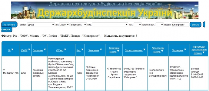 Детали: Согласно сайту Госархстройинспекции, ГАСИ выдал разрешение на строительные работы на объекте "Реконструкция имущественного комплекса – здания "Киевпроект" под многофункциональный комплекс по ул. Богдана Хмельницкого, 16-22 в Шевченковском районе Киева" в сентябре 2019 года.