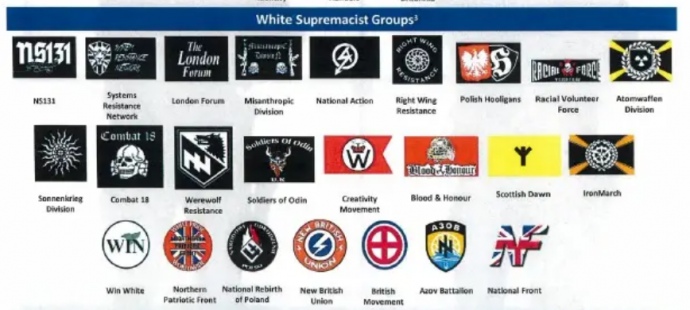 В разделе организаций, исповедующих идею доминирования белой расы, приведена символика полка "Азов".