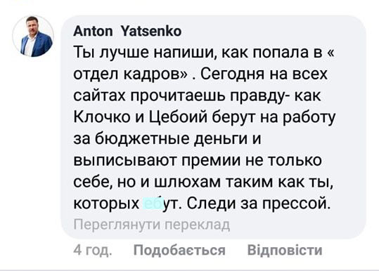 - В феврале 2018 года нардеп Яценко заявил коммуникаторше Общественного движения "Честно", что она получила работу через постель.