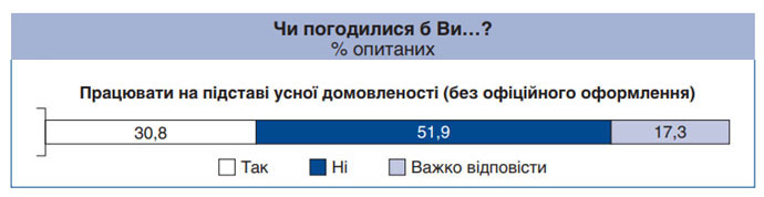 При этом работать на основании устной договоренности согласились бы 30,8% опрошенных (21% граждан сообщили, что сейчас работают без оформления), а 51,9% опрошенных заявили, что не пошли бы работать без оформления.