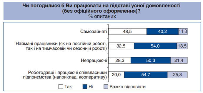 Больше всего желание работать в "теневом" секторе выражают самозанятые, среди которых 48,5% соглашаются работать без официального оформления. На "устную договоренность" согласны 32,5% наемных работников и только 20% работодателей и работающих совладельцев.