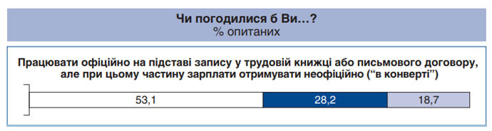 Дословно: "Согласились бы работать официально (на основании записи в трудовой книжке или письменного договора) и получать часть зарплаты "в конверте" 53%. 16,6% ответили, что они официально трудоустроены и сегодня получают часть заработной платы "в конверте"".