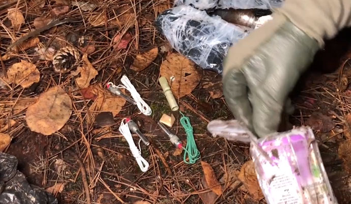 Дословно ФСБ РФ: "В обустроенных им в Симферополе тайниках обнаружено и изъято девять электродетонаторов, три запала, взрыватели замедленного действия и бризантное взрывчатое вещество общей массой более 5 кг".