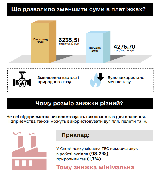 Снижение тарифа на отопление до 30% стало возможным из-за снижения цены на газ, которая в ноябре 2019 составляла 6235,5 грн за тысячу кубометров, а в декабре упала до 4276,7 грн.