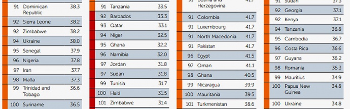Украина находится на 94 позиции из 195 стран, наряду с Доминиканской Республикой, Зимбабве, Нигерией и Ираном.