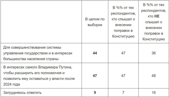 Детали: 44% опрошенных считают, что поправки в Конституцию РФ принимаются для "совершенствования системы управления государством и в интересах большинства населения страны".