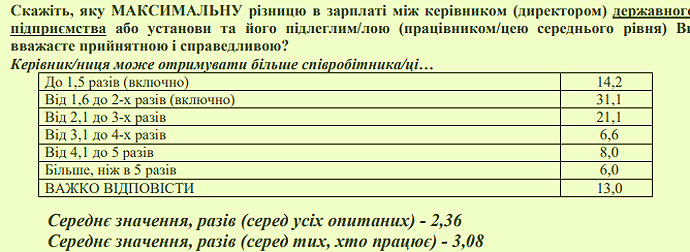 Половина украинцев считают приемлемой и справедливой максимальную разницу в зарплате между руководителем госпредприятия или учреждения и его подчиненными среднего уровня от 1,6 до 2-х раз (31,1%) и от 2,1 до 3-х раз (21,1).