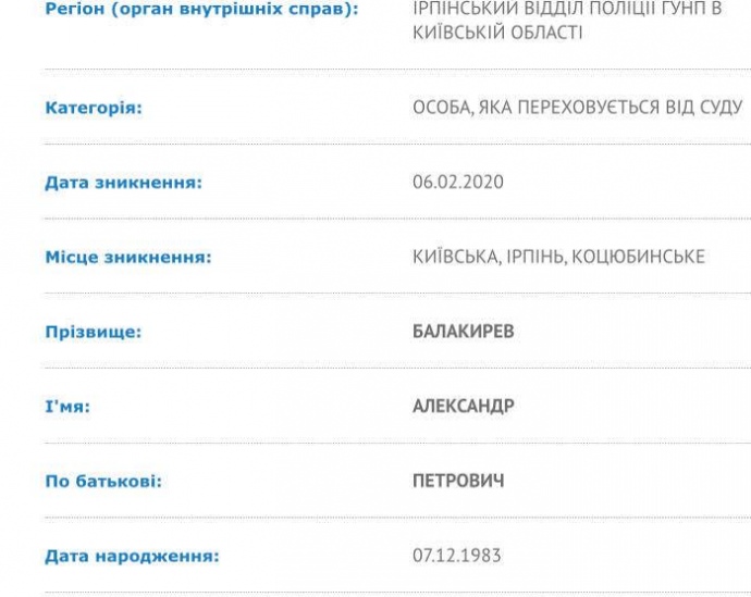 Дословно прокуратура: "Во время проведения оперативных мероприятий сотрудники полиции выяснили, что осужденный скрылся с места проживания в поселке Коцюбинское и место его нахождения пока не известно. В связи с этим Ирпенским отделом ГУ ЧП в Киевской области заведено оперативно-розыскное дело с целью установления местонахождения осужденного Балакирева, он объявлен в розыск".