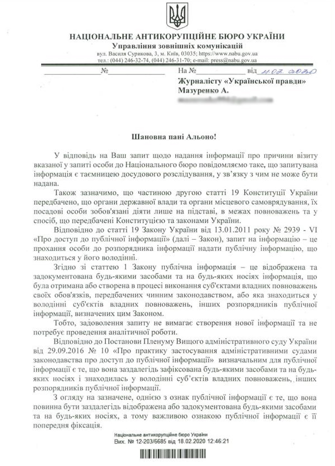 Дословно: "В ответ на ваш запрос о предоставлении информации о причинах визита указанного в запросе лица к Национального бюро сообщаем следующее, что запрашиваемая информация является тайной досудебного расследования, в связи с чем не может быть предоставлена".