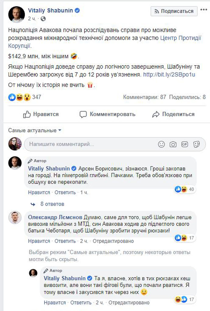 В Facebook Шабунин отшутился и обратился к Авакову, которому подконтрольна Нацполиция: "Арсен Борисович, признаюсь. Деньги закопал на огороде. На полуметровой глубине. Пачками. Надо обязательно при обыске все перекопать".