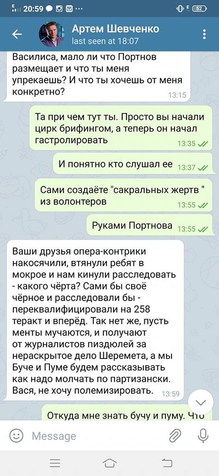 Прямая речь Шевченко из переписки: "Ваши друзья опера-контрики накосячили, втянули ребят в мокрое и нам кинули расследовать – какого черта? Сами бы свое черное и расследовали бы – переквалифицировали на 258 теракт и вперед. Так нет же, пусть менты мучаются и получают от журналистов пиздюлей за нераскрытое дело Шеремета, а мы Буче и Пуме будем рассказывать, как надо молчать по-партизански".