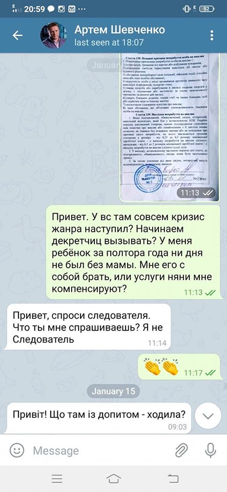 Мазурчук также обнародовала предварительную переписку с Шевченко за конец декабря 2019 и января 2020 года относительно обнародованного МВД разговора с Юлией Кузьменко в отношении детей Маруси Звиробий.