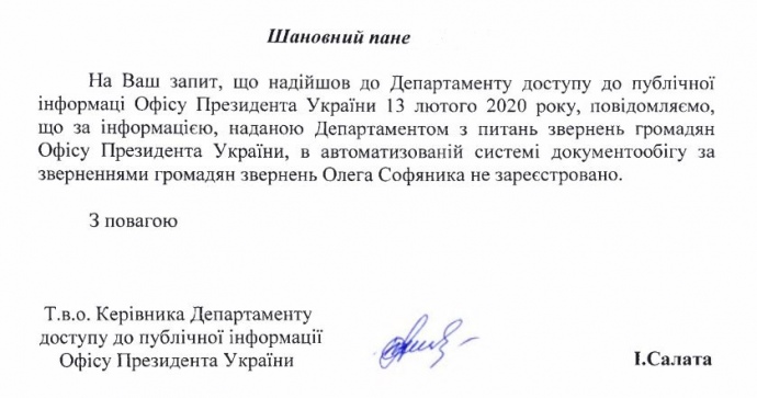 Заявление Офиса дословно: "По информации, предоставленной Департаментом по вопросам обращений граждан Офиса Президента Украины, в автоматизированной системе документооборота по обращениям граждан обращений Олега Софяника не зарегистрировано".
