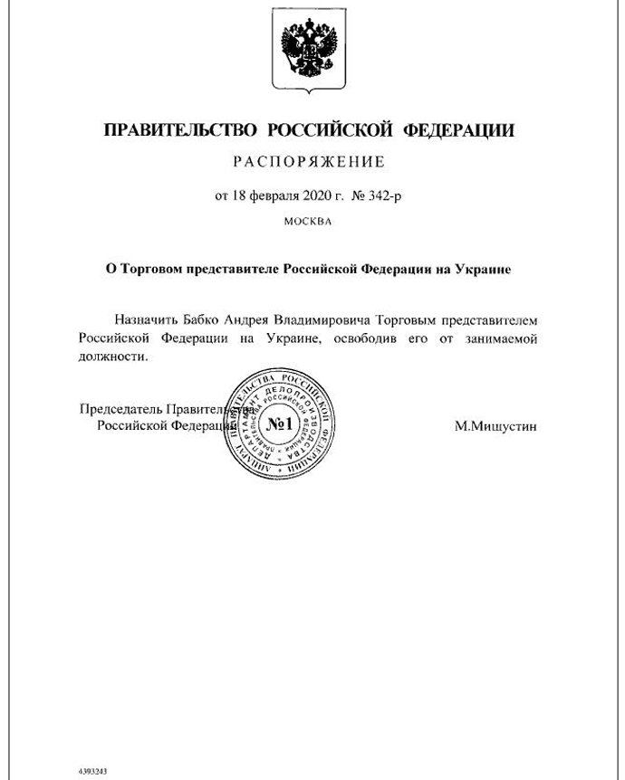 Дословно: "Назначить Бабко Андрея Владимировича торговым представителем Российской Федерации в Украине, освободив его от занимаемой должности".