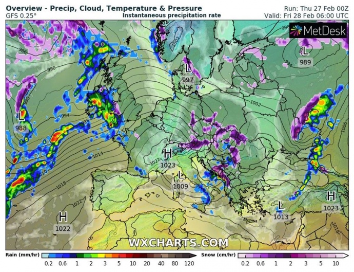 В четверг, 28 февраля, из-за циклона Левобережья Украины накроют дожди и мокрый снег, осадки будут сопровождаться сильным ветром.