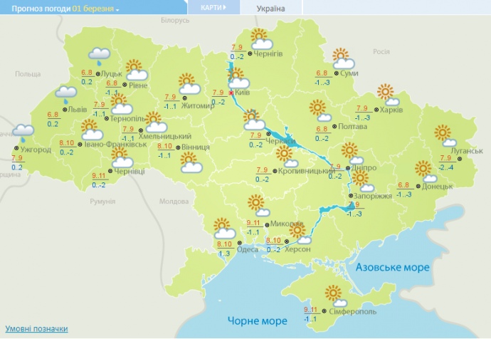 Температура ночью от 0 до -2°, на востоке Украины до -4°. Днем 6-10 тепла, в Черновицкой области и на юге до +11°.