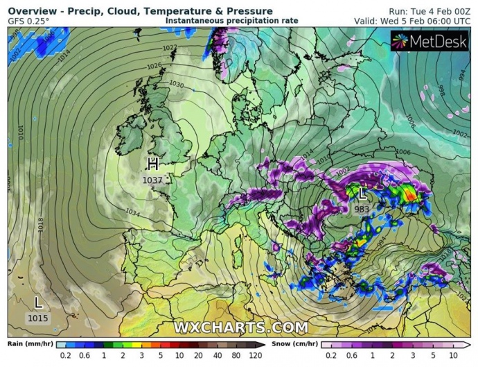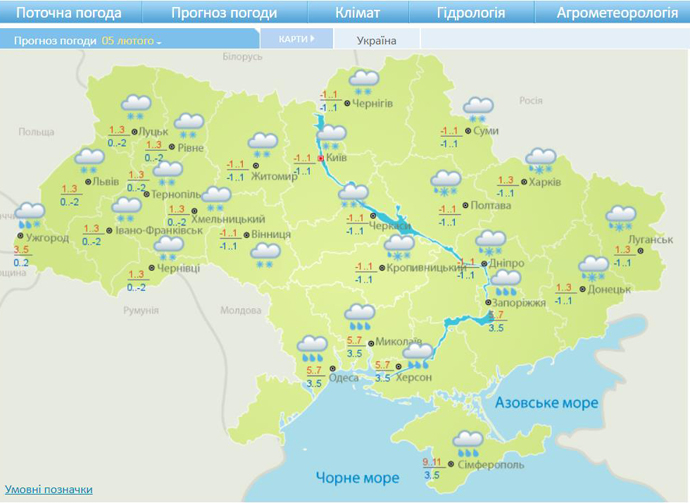 Дословно: "Самая сложная погода 5-го февраля в результате выхода южного циклона, ожидается в центральных, восточных областях, на юге, в Карпатах, на Прикарпатье и Закарпатье.