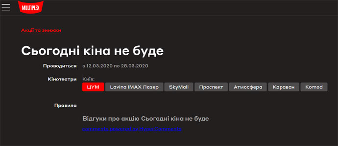 На сайте сети указано "Сегодня кино не будет. Проводится с 12.03.2020 по 28.03.2020".