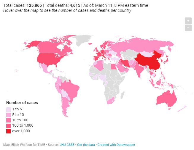 - За зиму 2019-2020 гг новый коронавирус распространился в Китае, а затем разошелся по всему миру – он зафиксирован уже в 116 странах или территориях, всего 127 750 человек заразились (две трети, 80,9 тысяч, – в Китае), 4 717 человек умерли, 68 307 – выздоровели.