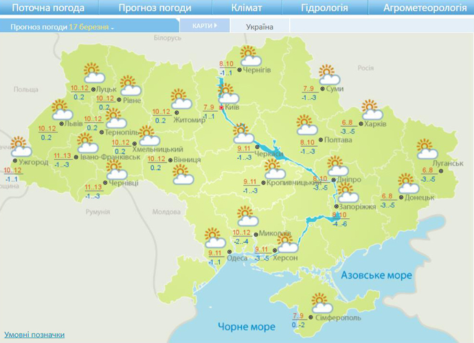 Дословно: "17-го марта в большинстве областей будет преобладать сухая погода, разве что на Западе и Севере атмосферный фронт обусловит небольшой дождь.