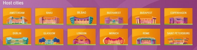 Матчи европейского чемпионата должны принять 12 городов: Амстердам, Баку, Рим, Бухарест, Будапешт, Копенгаген, Дублин, Глазго, Лондон, Санкт-Петербург, Мюнхен, Бильбао.