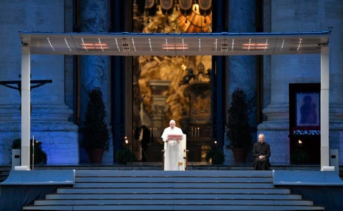 "Густая тьма опустилась на наши площади, улицы и города", - сказал он, и призвал всех к единению ради победы над эпидемией и спасения мира.