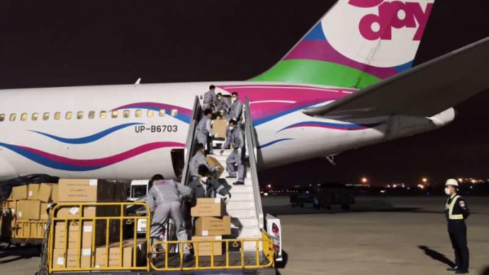 Дословно: "Сейчас в международном аэропорту м.Сямень (пров. Фуцзянь) самолет авиакомпании "SCAT" Boeing 767-300 загружается очередной партией медицинских масок, защитных костюмов и других противоэпидемических средств для Украины".